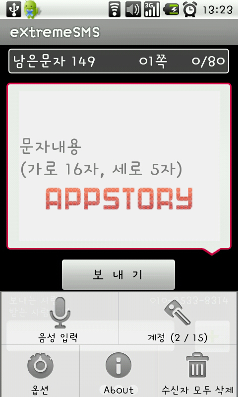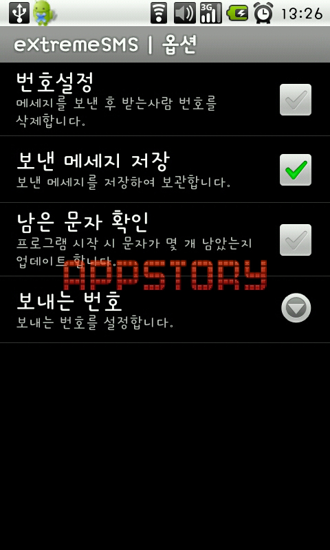 ¿É¼Ç - ¹øÈ£ ¼³Á¤, º¸³½ ¸Þ½ÃÁö ÀúÀå, ³²Àº ¹®ÀÚ È®ÀÎ, º¸³»´Â ¹øÈ£ µîÀÇ Á¦¾î°¡ °¡´ÉÇÏ´Ù.