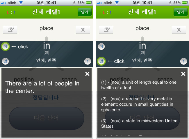 °¢ ´Ü¾î¸¦ Ŭ¸¯ÇÏ¸é ¶æÀÌ Çѱ۷Π³ª¿À°í ¹Ù·Î ¿ø¾î¹ÎÀÇ ¹ßÀ½±îÁö ³ª¿Â´Ù.