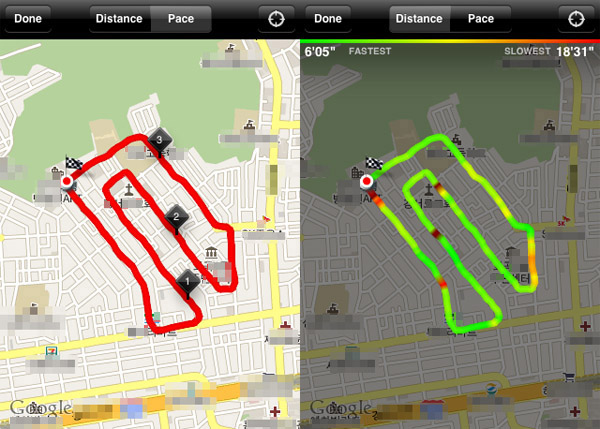 GPSÃß°¡¿¡ µû¶ó, ±¸±Û¸Ê°ú ¿¬µ¿ÇÏ¿©, ÀÚ½ÅÀÌ ´Þ¸° ±æÀ» µ¹ÀÌÄÑ º¼ ¼ö ÀÖ½À´Ï´Ù. »Ó¸¸ ¾Æ´Ï¶ó, µû¶ó ±¸°£º° ¼Óµµ¸¦ »ö±ò·Î Ç¥½ÃÇØ ÁÝ´Ï´Ù. (Runkeeper´Â ¸·´ë±×·¡ÇÁ·Î º¸¿© Áá´Âµ¥, ¾Æ¹«·¡µµ »öÀ¸·Î º¸¿©ÁÖ´Â °ÍÀÌ ´õ¿í Á÷°üÀûÀÌÁÒ.)